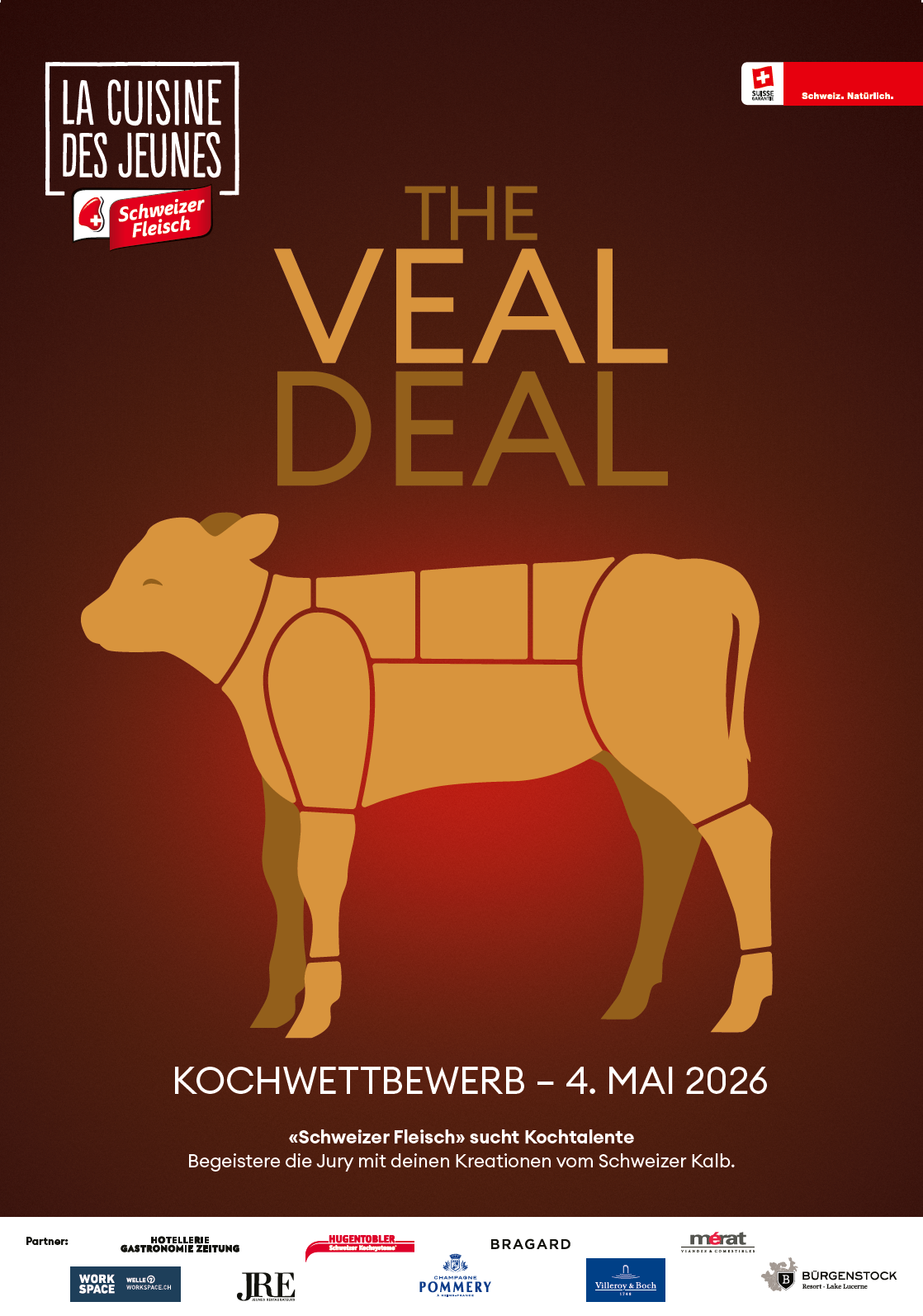 Unter dem Motto «The Veal Deal» ruft «Schweizer Fleisch» die Kandidatinnen und Kandidaten dazu auf, ein Hauptgericht und ein Amuse-Bouche vom Schweizer Kalb zu kreieren. Die Anmeldung ist bis am 20. Februar 2026 möglich. Für den Kochwettbewerb am 4. Mai 2026 wählt die Jury fünf junge Talente aus, die ihre Kreation live vor Publikum und Fachpresse in der Welle7 am Bahnhof Bern zubereiten.