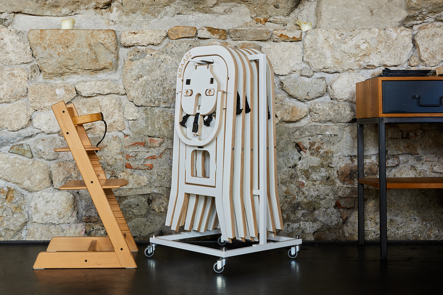 Der KRAABE-Trolley wurde speziell für den Einsatz in Restaurants und Hotels entwickelt – und bietet Platz für bis zu sechs zusammengeklappte Kraabe Kinderstühle.