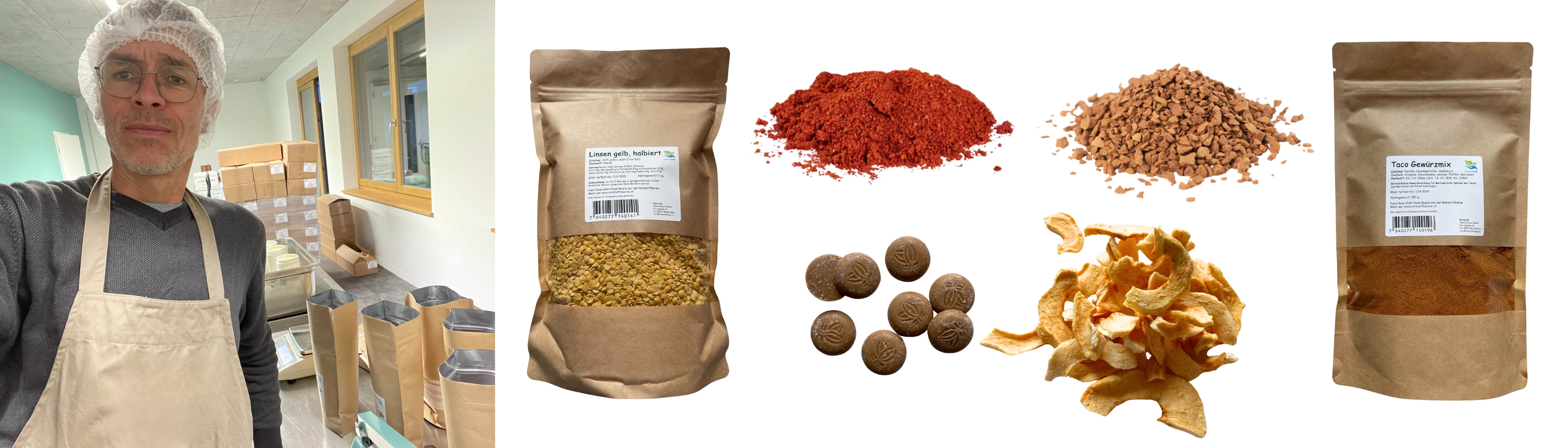 Notre assortiment change régulièrement et comprend des matières premières à longue conservation telles que du thé, des légumineuses, de la farine, du chocolat, du sucre et des épices, ainsi que, parfois, du beurre, du lait de coco ou des compléments alimentaires.