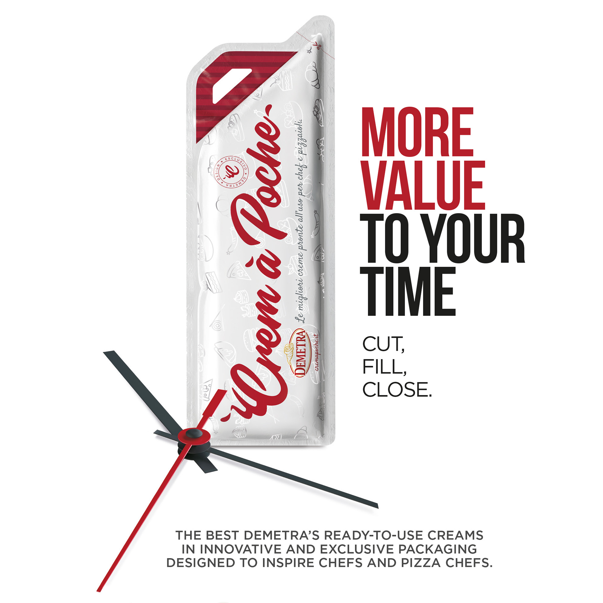 La qualité Demetra s’exprime sous une forme inédite: Crem-à-poche, une gamme de crèmes gastronomiques prêtes à l’emploi conditionnées dans une poche au design exclusif, inspirée du traditionnel sac-à-douille.