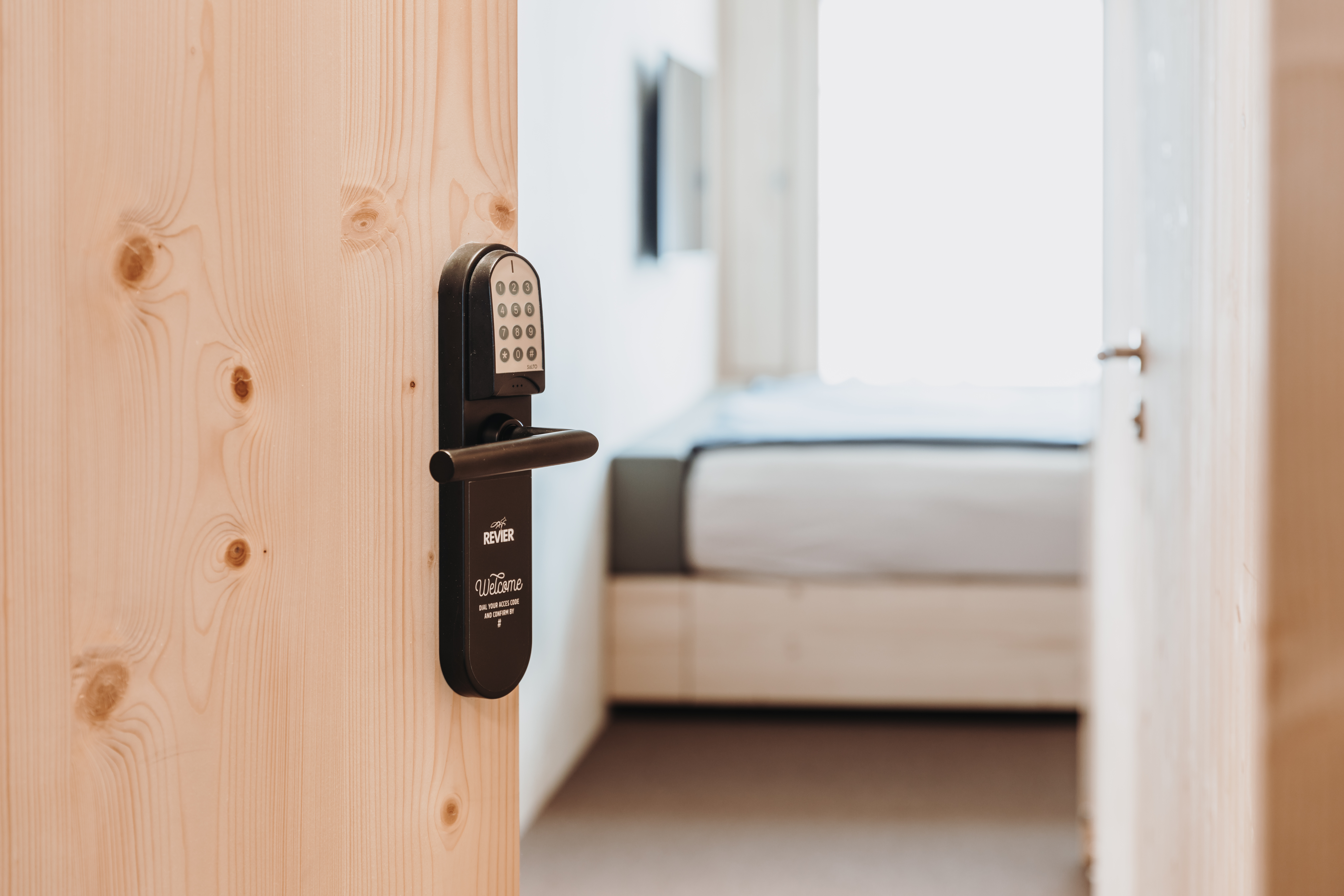 Au REVIER Mountain Lodge à Adelboden, qui compte 86 chambres, toutes les chambres d'hôtel, les locaux de service et les entrées principales sont équipés de cette solution. Les clients accèdent aux chambres d'hôtel à l'aide d'un code PIN, ce qui permet d'ouvrir la porte sans support physique. Les employés utilisent l'application (Mobile Access) ou une puce.